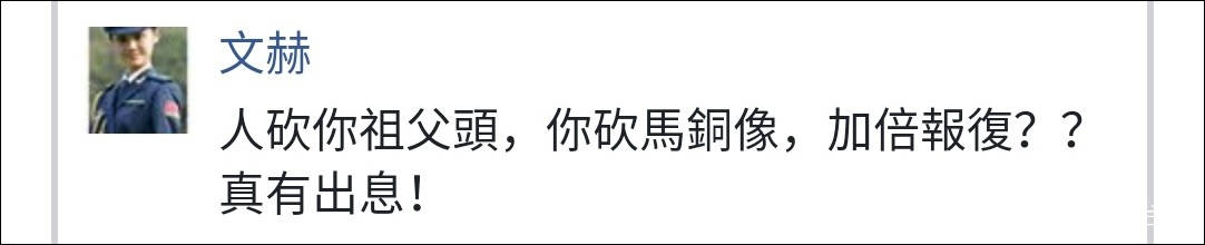 據台灣媒體報道稱,22日凌晨2點許,大約10名大學生到政治大學後山的蔣介石騎馬銅像旁,用鋸子把馬腳鋸斷,留在現場。事後在社交媒體上發表長篇聲明,並公佈事發過程的照片,引起輿論關注。