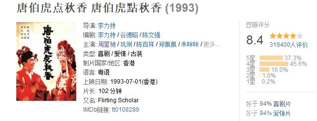 誠然,這個分不算低了,但依然配不上《唐伯虎點秋香》的地位。這部電影和《大話西遊》一樣,是構建華語互聯網文化最重要的幾部電影之一,當年它的台詞,和這種無厘頭惡搞精神,影響了整整一代中國觀眾。