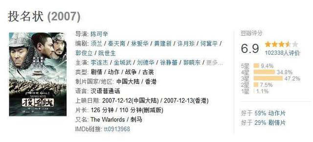 不過這部不是李連杰主演電影最被豆瓣低估的,陳可辛導演的《投名狀》,豆瓣評分曾經只有6.7,後來升到6.9,現在升到了7分。