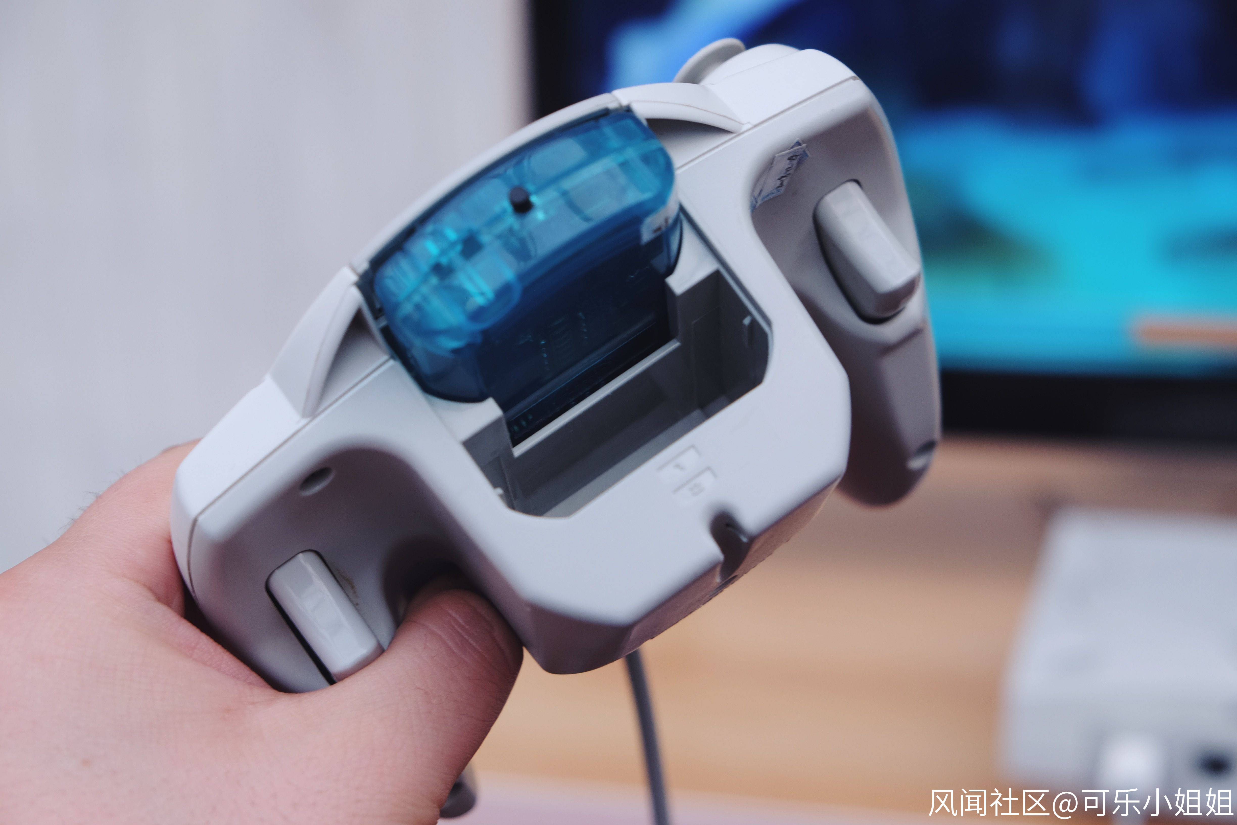 在小型顯示器槽下方,我們還能看到第二個相同的插槽,它是用來作什麼的呢?原來在當時,開發人員想到既然插槽可以外接顯示器,就能外接其它元件,讓遊戲手柄具有更多各種各樣的功能。通過第二個插槽,玩家可以外接諸如震動包、麥克風等元件,這個設定在今天看來依然腦洞大開,不過相應的,手柄的重量也隨之增加不少。