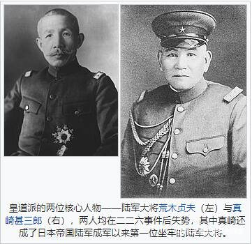 “皇道派”強調日本文化的重要性,主張精神面超越物質面,並認為對蘇聯展開進攻極具必要性,是“徵俄派”;而“統制派”則受到德國總參謀部思想的強烈影響,看重由中央來計畫經濟與軍事的作法(即總體戰理論)、技術面的現代化與機械化,並主張朝中國擴張,是“徵華派”。皇道派於荒木在1931至1934年間擔任陸軍大臣期間掌握了大部分重要職缺,然而在該人下野後,其成員位置又多由統制派軍人所替補。