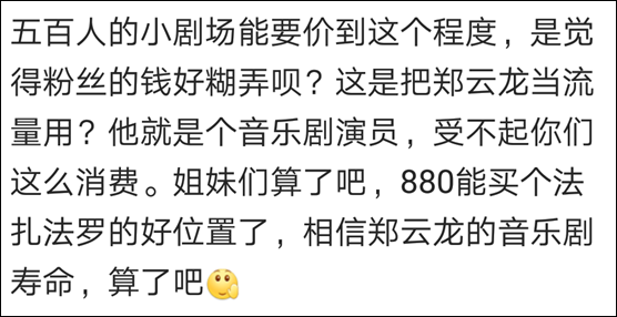 據粉絲説,鄭雲龍一直致力於推廣音樂劇,希望能有更多人來關注這個領域,而這一次對於大麥的不滿也主要在這裏,粉絲認為,鄭雲龍辛辛苦苦的推廣,被這波票價給破壞了。