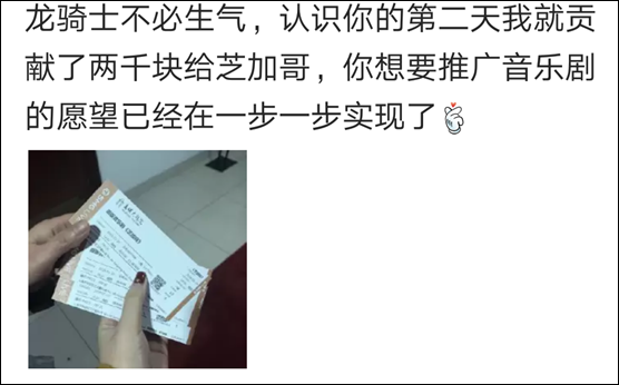 因此在鄭雲龍那條微博下面,很多粉絲紛紛曬起了自己去看其他音樂劇的票根,一來是抗議《謀殺歌謠》北京場的票價,二來也是對鄭雲龍推廣音樂劇的肯定和鼓勵。