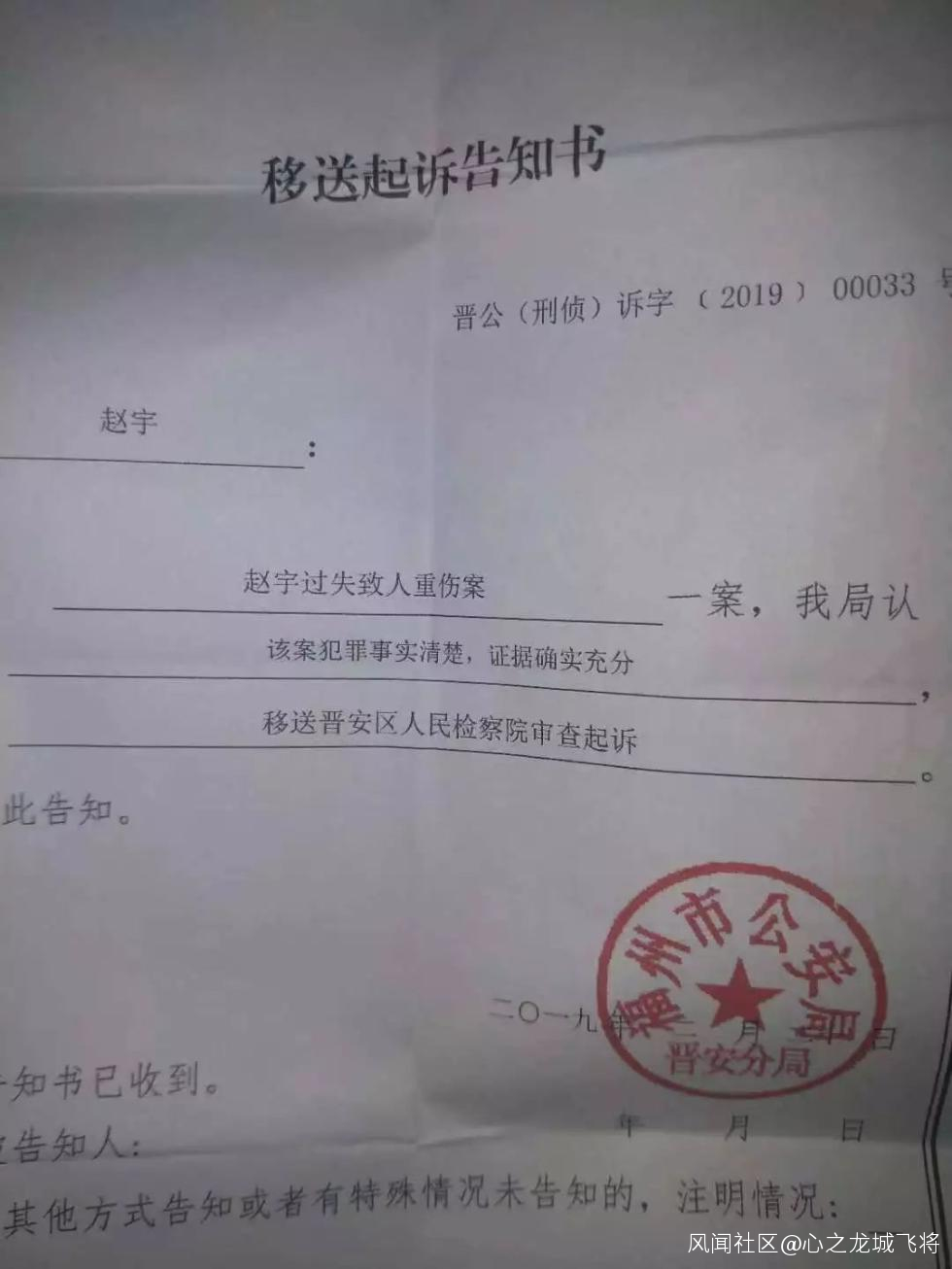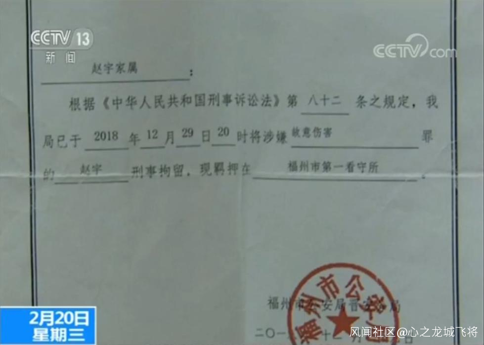 2月20日下午,福州市公安局晉安分局以過失致人重傷罪將趙宇移交晉安區人民檢察院。