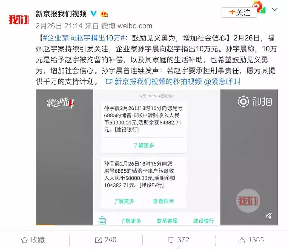 據報道,近日,企業家孫宇晨向趙宇捐出10萬元。