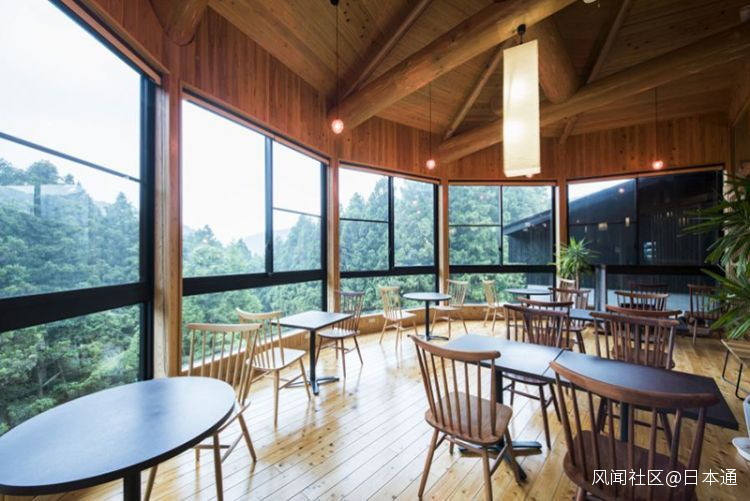 在露天温泉室的休息空間,感受着樹木温暖,大大的窗户就像在畫圓一樣展開。因為腳下是玻璃,站在窗户的旁邊就會有一種特別的懸浮感。窗户外面山上一片茂盛的樹林,彷彿也能享受到森林浴。只要是泡温泉的人,不管誰都可以免費享受,所以在泡完温泉就好好利用這個涼爽處。