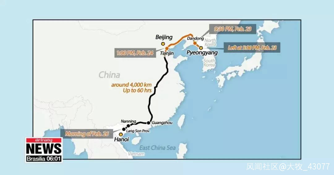 金正恩此次的行程路線,依舊還十分神秘。日本和韓國媒體最先引述消息來源透露,他從平壤出發後,將經丹東進入中國,一路南下直抵中越邊境越南一側的同登(Dong Dang)車站。路透社引述消息來源説,金正恩將在同登下車,換乘汽車跑170公里抵達越南首都河內。