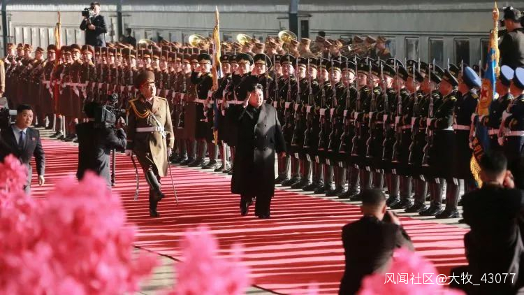 不同於以往,金正恩這次離境十分隆重。根據朝中社公佈的照片和視頻,當天的平壤車站鋪了紅毯,士兵、民眾官員等列隊為金正恩送行。