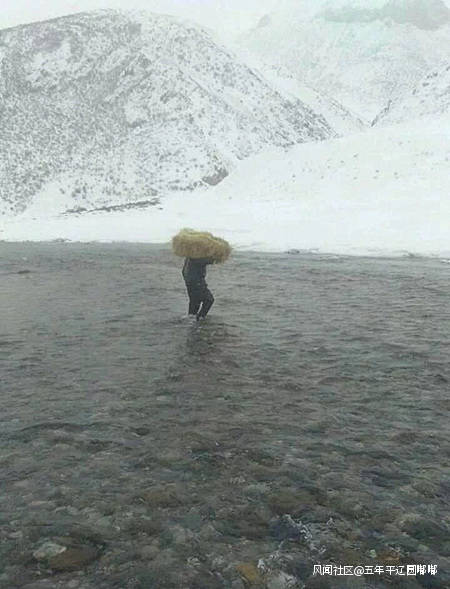 冰天雪地中,生態管護員赤腳蹚冰水送飼料。圖片來源:雜多縣扎青鄉政府