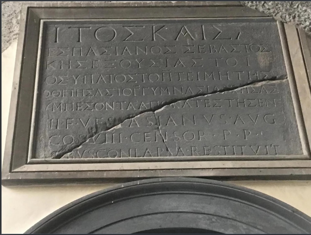 那不勒斯的一段文字,讚揚皇帝提圖斯為火山爆發後的重建工作。