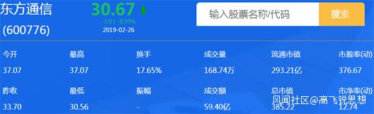 在A股市場上妖氣縱橫的東方通信在連續10來個漲停後,2月26日,終於以開盤漲停,收盤大跌8.99%的接近天地板行情終結瘋狂,當天成交額59.4億元,換手率17.56%,震幅19.32%,主力資金淨流出5.5億元。東方通信是在收盤前最後半小時閃崩的,眾多不幸追漲的小散成為接盤俠。