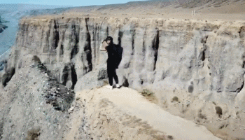 視頻中,一個男子站在懸崖邊,而周圍的地貌,懸崖險峻、巉巖林立,站在這裏,如同置身外星一般。