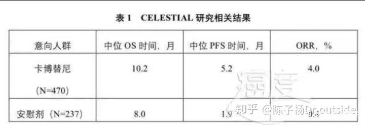 截止第二次中期分析,使用卡博替尼組患者的中位總生存期(OS)達到了10.2個月,而安慰劑組為8.0個月;卡博替尼組的死亡風險降低24%。卡博替尼組的無進展生存期達到5.2個月,而安慰劑組為1.9個月;客觀緩解率也有明顯改善,卡博替尼組的ORR為4.0%,安慰劑組為0.4%。
