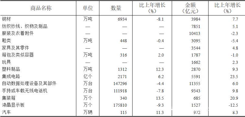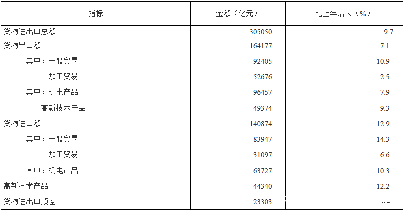 全年貨物進出口總額305050億元,比上年增長9.7%。其中,出口164177億元,增長7.1%;進口140874億元,增長12.9%。貨物進出口順差23303億元,比上年減少5217億元。對“一帶一路”[49]沿線國家進出口總額83657億元,比上年增長13.3%。其中,出口46478億元,增長7.9%;進口37179億元,增長20.9%。