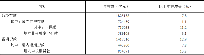 全年社會融資規模增量[51]19.3萬億元,按可比口徑計算,比上年少3.1萬億元;年末社會融資規模存量[52]200.7萬億元,比上年末增長9.8%。年末全部金融機構本外幣各項存款餘額182.5萬億元,比年初增加13.2萬億元,其中人民幣各項存款餘額177.5萬億元,增加13.4萬億元。全部金融機構本外幣各項貸款餘額141.8萬億元,增加16.2萬億元,其中人民幣各項貸款餘額136.3萬億元,增加16.2萬億元。