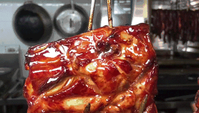 口味定下了,好的叉燒還會選用豬肥瘦得當、帶點軟筋的梅頭部位(摸摸你自己後背靠頭的上肩肉)。豬肉必須用新鮮的,才有紋理細密的口感,如果是冷凍肉做出的叉燒,廣東人會很輕易地辨別出它鬆垮的肉質。把醃了三個小時的豬肉用烤叉串起,放進明火掛爐裏燒四十五分鐘。燒的時候還需要不停轉身,來保持它受熱的均勻。