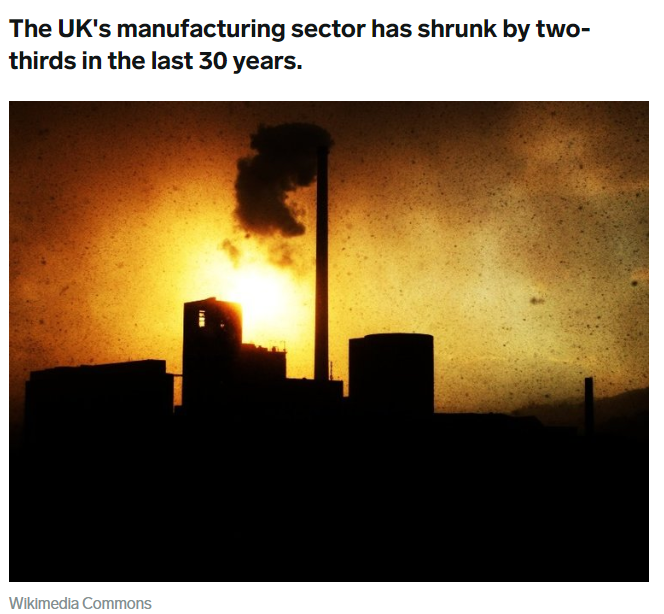 英國衞報去年5月份的報道:過去的三十年,英國的製造業萎縮了三分之二