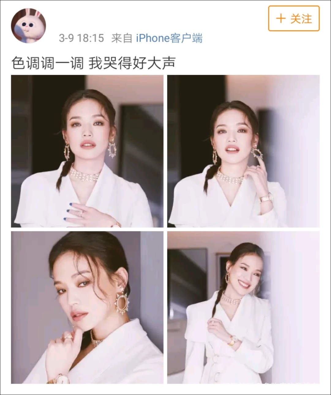 同時還發文稱,“色調調一調,我哭得好大聲”,言外之意就是經過這樣的修圖後,舒淇更加美了。