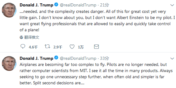 美國總統特朗普則發推特表達了”特別”的看法,“飛機正變得過於複雜,難以操作。如今飛行員已經不那麼被需要,需要的是麻省理工的計算機科學家。我在很多產品中都已看到這一點,總是在尋求一些不必要的‘進步’,但往往越古老和越簡單的會越好。(當出現故障時)有些決定是分秒必爭的,太複雜則會帶來危險。所有這一切都會付出昂貴代價,但收效卻微乎其微”, “我不知道你是怎麼想的,但我可不想讓愛因斯坦做我的飛行員,我想要偉大的專業飛行人員,可以輕鬆迅速地控制住飛機”。