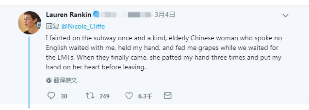 “我在地鐵上暈倒了,然後一個好心的、上了年紀的中國(華裔)女性一直陪着我,她一句英語都不會説。在我們等待急救人員的時候,她握着我的手,還給我吃葡萄。當急救人員終於來了之後,她輕拍我的手三次,並把我的手放在她的心臟處(鼓勵我),之後才離開。”