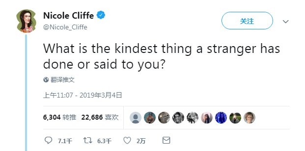 妮科爾·克利夫在推特發起話題:陌生人對你做過最善良的事兒或説過最善意的話是什麼?