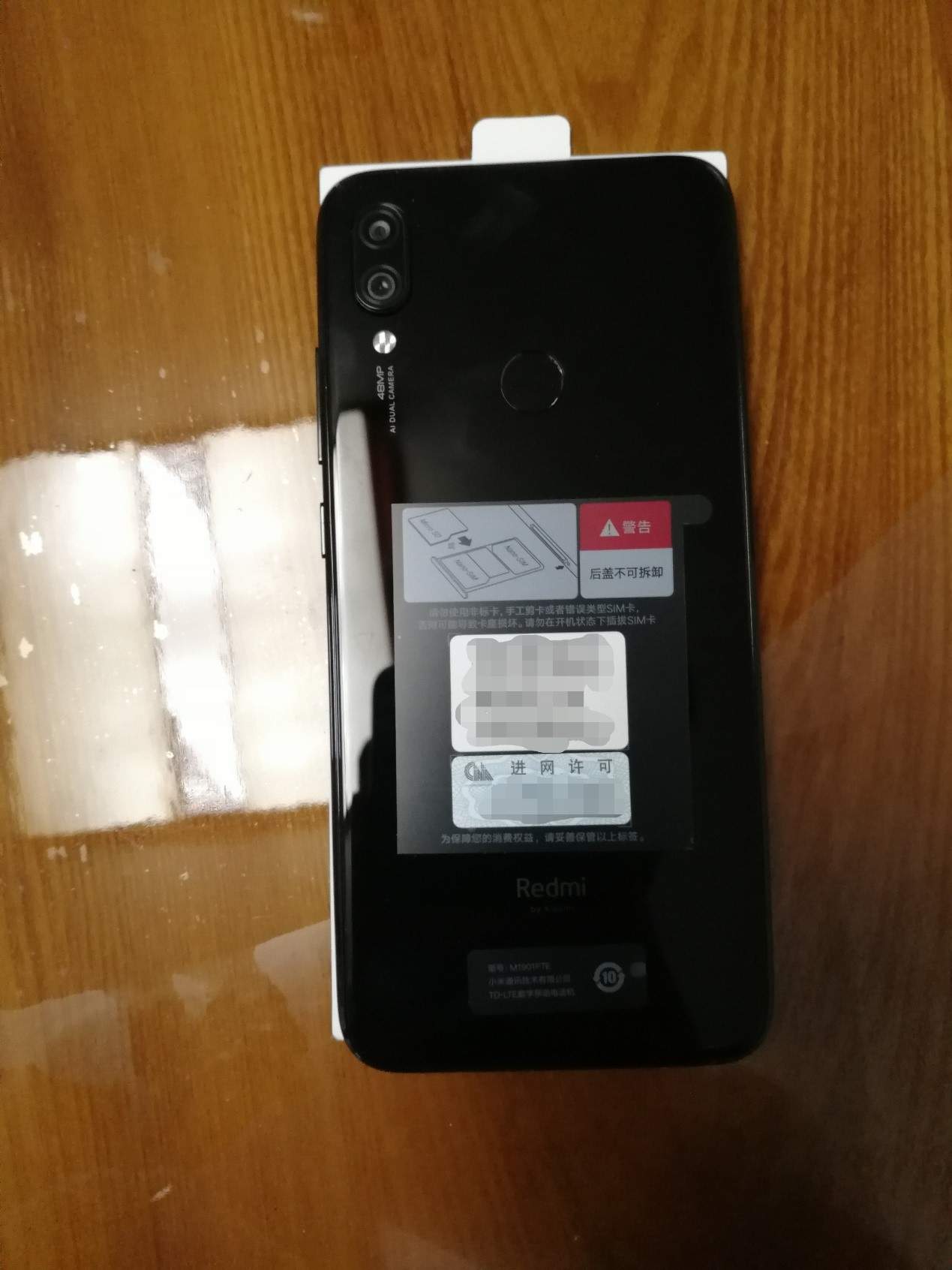 再看背面,雖然沒有撕掉進網許可標籤(這機子還得送出去呢。。。)影響了整體觀感,但是仍然能感受到玻璃後蓋的驚豔,尤其在考慮到這是一款千元機的情況下。我手上這台亮黑色相對來説平凡一些,不過看其他顏色機器的測評,紅米NOTE7後蓋的配色水平是超過了千元機這個價格區段的。如果説有什麼小問題的話,那就是玻璃後蓋容易變成指紋收集器了。