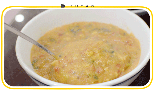 將上述三種原料放進缽子裏,用棍子舂搗,邊攪邊添些芝麻、花生、黃豆等。擂好之後加水煮沸,滿室皆香。