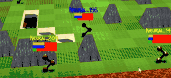 在最初的狹小地圖中,AI們確實不可避免地發生了戰鬥。這很大程度上不僅是由於資源有限,更多的其實是因為它們沒有嘗試其他選擇的機會——每個AI都被設計有戰鬥策略,幾個AI遇到一起總會有AI判斷需要先開火,最後混戰在所難免。