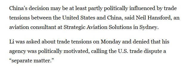 然而筆者必須指出,中國是目前737MAX最大的用户(目前數量為全球最多),民航管理局對737MAX8兩次事故非常重視,本着安全第一,嚴控安全風險,對安全隱患零容忍的原則宣佈737MAX8停飛,這是對旅客生命財產安全的負責,是對我國民航事業的負責。停飛純粹是出於技術上安全因素的考慮,而非政治因素。
