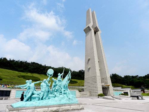 在光州火車站前乘坐向東的518路公交,便可以到達位於遙遠東北郊的518紀念公墓,這條路也被稱為“眼淚之路”。這個佔地極廣的公墓於1997年落成,將分葬各地的518死者的遺體集中歸葬於一處,當然了,是免費對外開放的,而且還有各種中文材料。公墓中的紀念館以圖片與視頻(有中文版)非常詳細的介紹了80年代以光州事件為高潮的韓國民主鬥爭運動,在結尾部分則與當代其他國家地區如緬甸、尼泊爾等地的政治運動進行了類比。如果有誰居心不良的打算在這裏看到俺天朝的敏感詞事件那一定要失望——這裏提到的與天朝有關的只有海峽對面台灣的228事件而已。