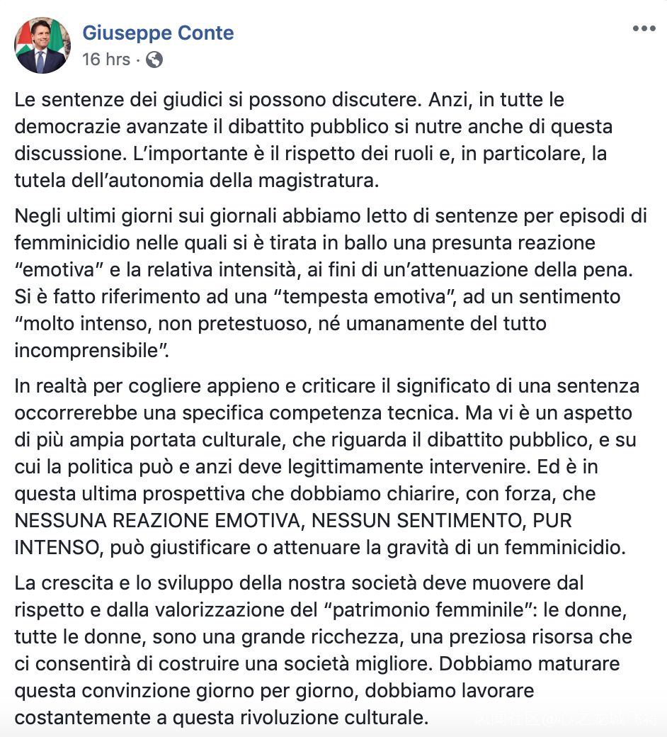 因為情感受到傷害殺了自己的女朋友或是妻子就能得到減刑?這一次,不僅公眾憤怒了,意大利總理孔特也憤怒了。