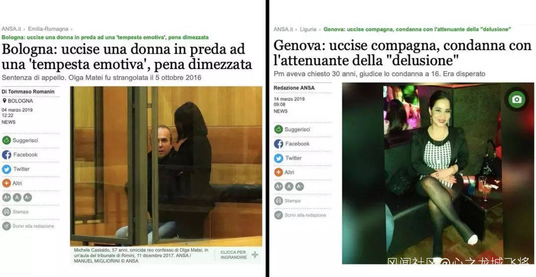 據路透社,本月早期,意大利博洛尼亞的上訴法院判處一名於2016年勒死自己伴侶的男性刑罰減半,由原來的32年監禁改判為16年監禁。原因是,法庭精神病學家稱該男子是行為是“情緒化的激情風暴”。
