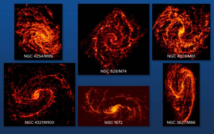 宇宙中的星系從外觀看大小各異、形態多樣,然而它們最顯著的差異是:它們在何處、如何生成新恆星的。為了更清晰的瞭解這種差異,以及恆星出生與星系環境之間的複雜關係,阿塔卡馬大型射電觀測陣列(ALMA)正在對螺旋星系的星系盤進行細緻的觀測,以研究它們的恆星孵化雲團。