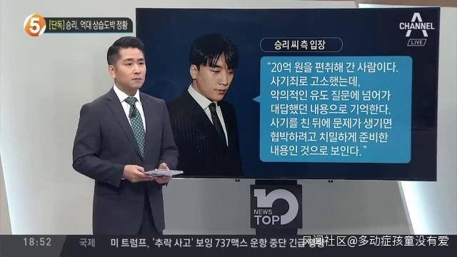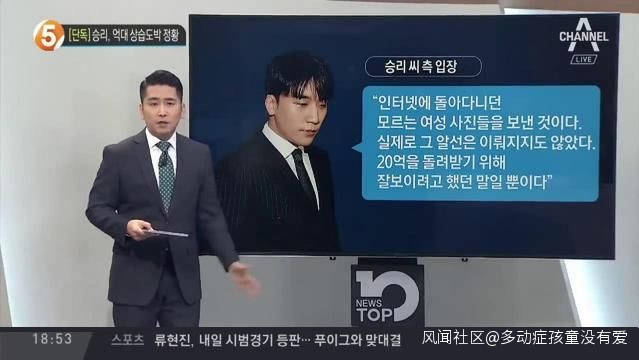 在14日晚韓國媒體Channel A播出的《NEWS TOP10》中,報道了新增的關於勝利本人性招待、賭博等問題的聊天記錄,以及勝利方面對此的立場。他表示,聊天羣中那些骯髒的話語是為了討好一位曾經詐騙過自己的前輩所説的,而所謂的性交易最後面也沒有成功。