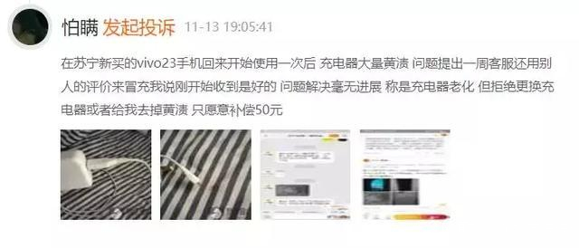 還有的消費者購買vivo新手機使用一次後,充電器就出現大量黃漬。而在這位消費者提出問題後,被客服各種推諉,問題始終沒有得到解決。