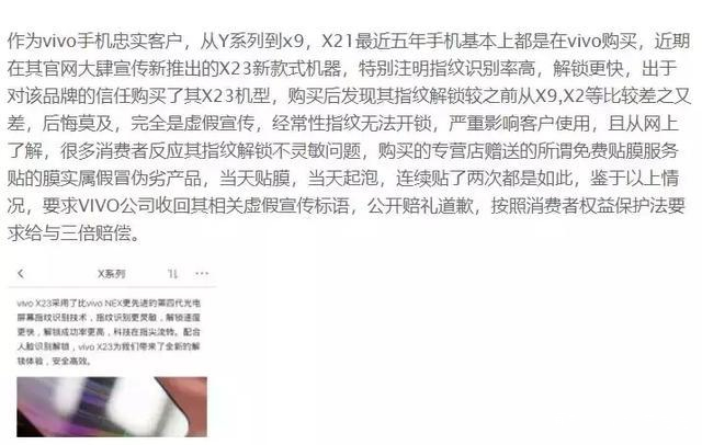就連vivo引以為傲的屏下指紋解鎖,也成為了消費者吐槽的對象。有多位消費者在使用過程中吐槽vivo X23的屏下指紋解鎖不夠靈敏,存在一定的質量問題。