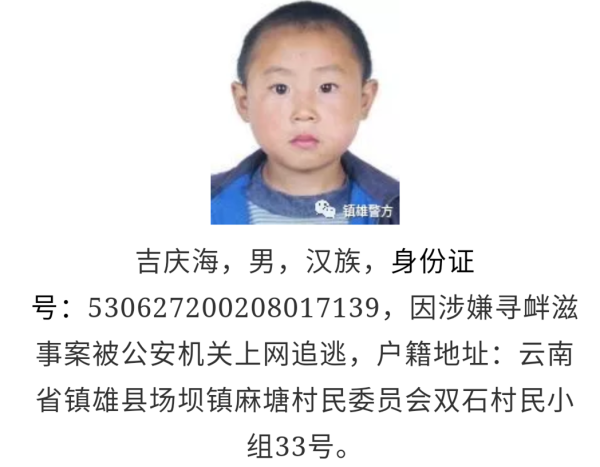 例如,公告中提到的“吉某某,男,漢族,身份證號:53062720020801****,因涉嫌尋釁滋事案被公安機關上網追逃,户籍地址:雲南省鎮雄縣場壩鎮麻塘村民委員會雙石村民小組33號。”