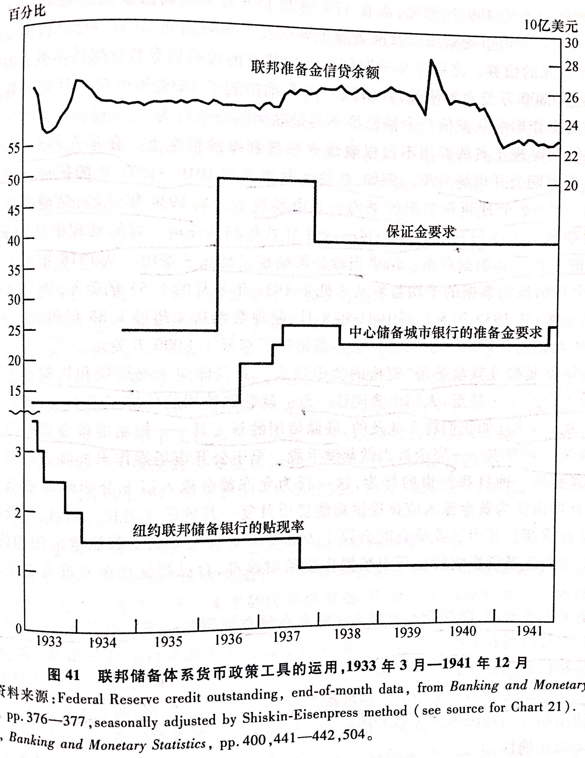 看圖可以得知,在1933年至1940年期間,聯儲基本沒有使用公開市場操作和再貼現工具向市場提供貨幣並降低利率。
