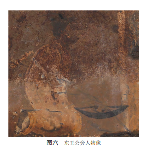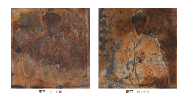 西王母和東王公的圖像位於孔子衣鏡鏡框上部的左右兩側。 雖然圖像損毀嚴重,人物形象細節已不可辨, 但右側人物面部可以看出鬍鬚的痕跡,且該人物頭戴冠,應為男性。 右側人物的衣服為淺青色,左側人物為白色(圖三、四)。 這兩種顏色或有意對應五行系統中東方的青色和西方的白色。