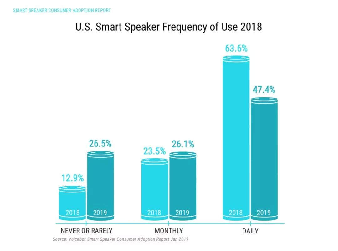 美國智能音箱調研機構voicebot.ai在今年3月7日發佈的報告中已經顯示,智能音箱日活用户從2018年的63.6%下滑到了2019年的47.4%。智能音箱作為大廠們寄予厚望的下一代入口,已然跌落神壇。
