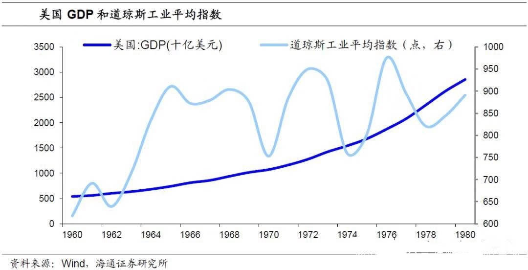 從1970-1980年短週期來看,股市劇烈波動,從1973年10月石油危機開始到1974年底,美國標準普爾500下跌了43.3%,是美國戰後最大跌幅。隨後又在1975年反彈,到1976年基本回到1973年的高點水平。這樣的震盪,既反映出石油危機“輸入型通貨膨脹”對經濟體的衝擊,同時,震盪,而不是震盪上升,反映出企業利潤增長不足以支撐股市上漲,經濟增長乏力的局面。