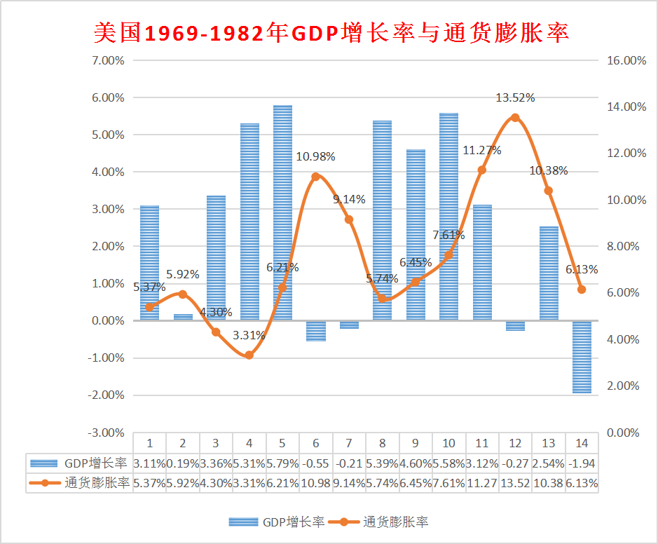 從1969年12月至1982年12月,美國經歷了長達13年的“滯漲”。在此期間,GDP的實際增速為2.9%,年平均通貨膨脹率達到7.60%。1973年工業生產下降了15.3%,持續時間18個月;1979年工業生產下降了11.8%,持續時間44個月;企業破產數量達25300家,失業率最高時達10.8%。通貨膨脹不斷上升,科技發展進入低潮,失業大大增加,經濟增速大大減緩。