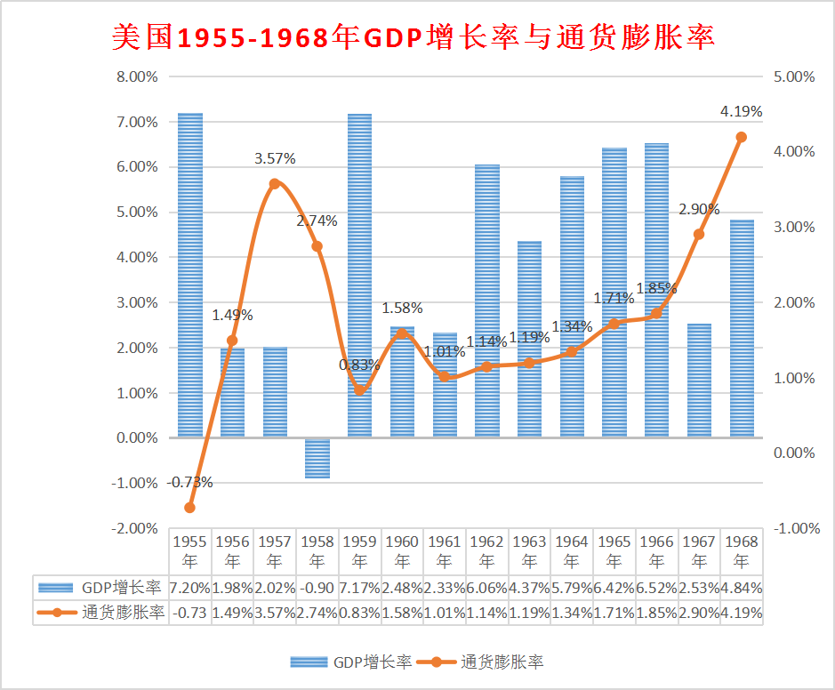 艾森豪威爾任總統期間,經常面對通貨膨脹的威脅,還發生過三次經濟衰退。在1950-1951年通貨膨脹後,美聯儲從財政部獨立出來,有了貨幣政策自主權。鬆緊搭配的財政政策和貨幣政策,使美國財政在1951、1956、1960年出現預算盈餘。整個50年代,凱恩斯主義者逐漸認識到貨幣政策的作用,但仍將貨幣政策看做是財政政策的輔助手段。因此,我們看到50-60年代的通貨膨脹率並不高。但這種政策並未能徹底消除失業和經濟週期波動,1955-1960年GDP平均增速為3.3%,低於其他主要資本主義國家。面對這種局面,美國的凱恩斯主義者決心把能達到充分就業均衡狀態的生產、消費潛力全部挖出來,對補償性財政、貨幣政策進行修改,以刺激經濟增長。