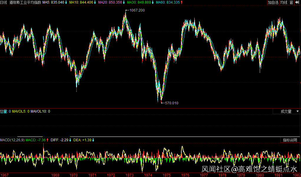 從美國股市百年曆史長週期來看,1970-1980年的股市是震盪市,1972年道瓊斯指數最高點是以後10多年的歷史最高點。時間放寬一些,從圖中還可以看出,道指從1966年至1984年都處於震盪階段,是美國股市100多年來震盪階段最長的時期。道指走勢反映了長期實行凱恩斯主義對經濟的嚴重傷害。
