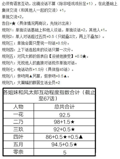 @神之罪人007 則統計了,截至漫畫第66話,五姐妹和男主的互動程度,五姐妹的分配較為平均,但會有微小的差距。@SakuraFanta 提到,日本也有粉絲計算過,幾位女主與男主互動數由高到低分別為二乃、一花、三玖、五月、四葉,與@神之罪人007 的統計結果基本一致。