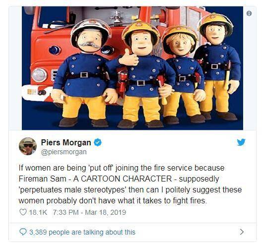 他在推特上説:“如果女性不願當消防員是因為《消防員山姆》使用了不恰當的性別用語,那我或許可以臆測,這些女性根本不適合當消防員”。