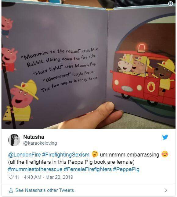 倫敦消防局的推文引發了爭議,一名推特用户上傳了一張《小豬佩奇》故事書中的圖片,上面清楚地畫着幾名女性消防員,還包括佩奇的媽媽。