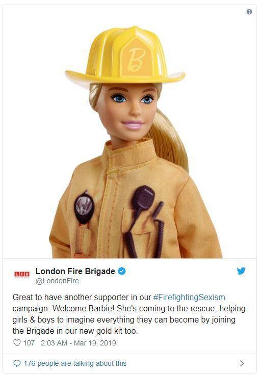 倫敦消防局發推文説:“歡迎芭比娃娃加入消防隊,她將投身於消防事業,幫助女孩和男孩拓展思路,盡情設想今後自己能從事什麼樣的工作。”