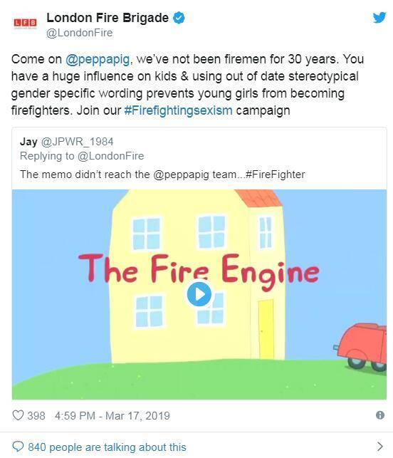 倫敦消防局發推特説:“可別這麼説了,佩奇,我們不當firemen已經有30年了。你們在小朋友當中有很大影響力,使用過時的刻板性別特定詞彙會讓女孩不願意當消防員。快加入我們的#消防員反性別歧視運動吧。”