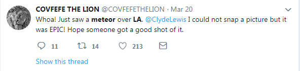 “哇!剛才看見有一顆隕石落在洛杉磯!我沒照下照片但是它太壯觀了!希望有人照下來了。”↓